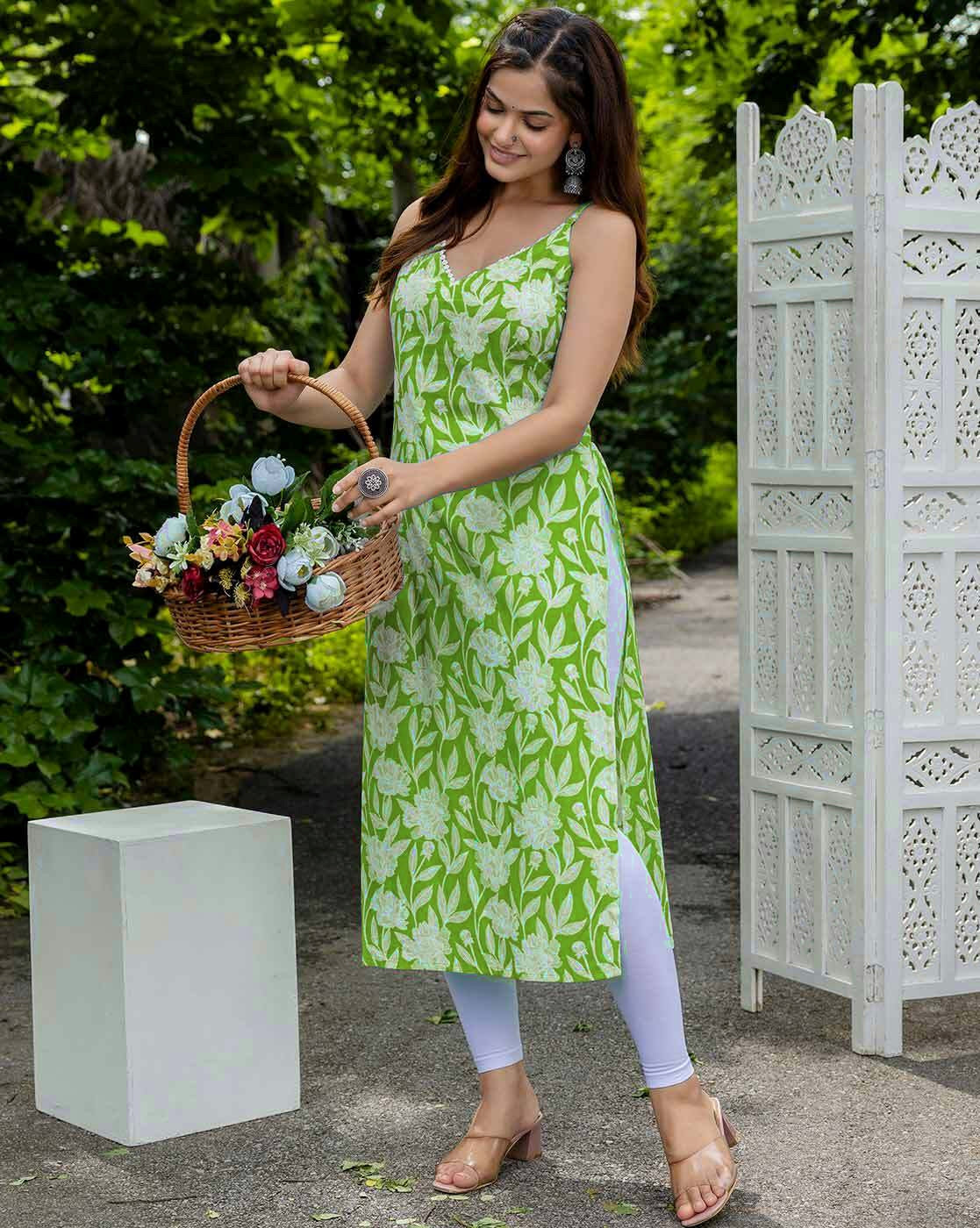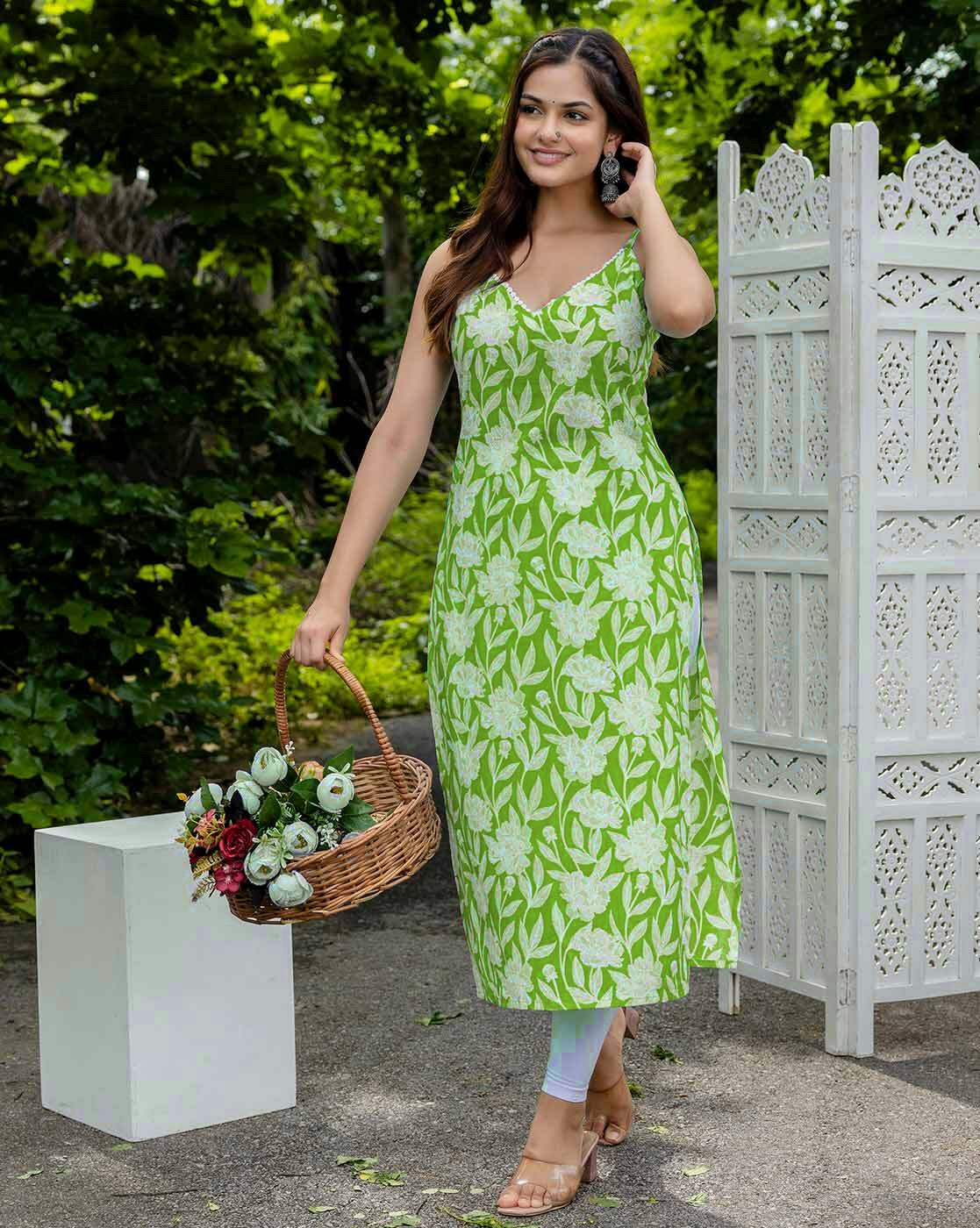 Floral Printed V-Neck Shoulder Straps Pure Cotton Straight Kurta