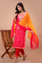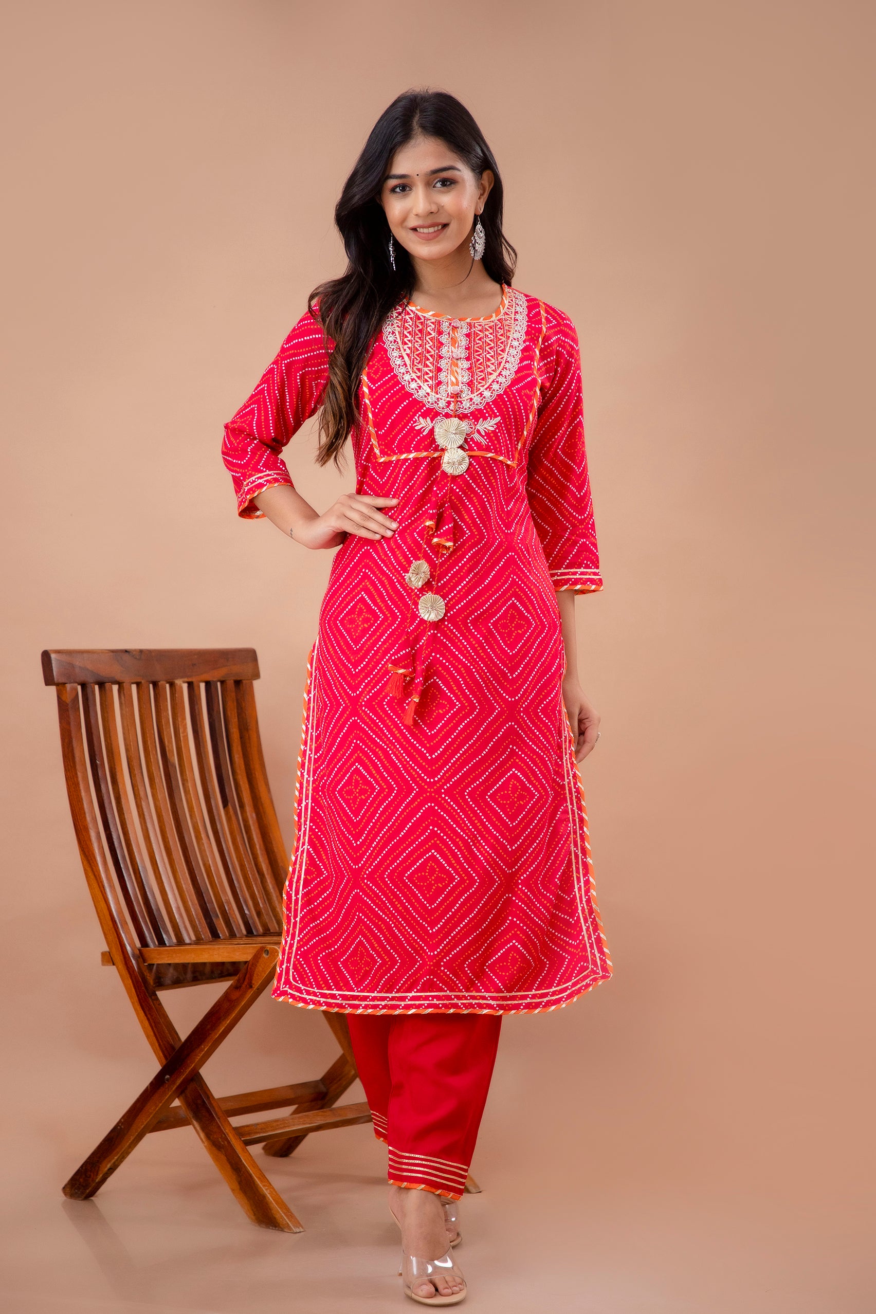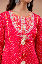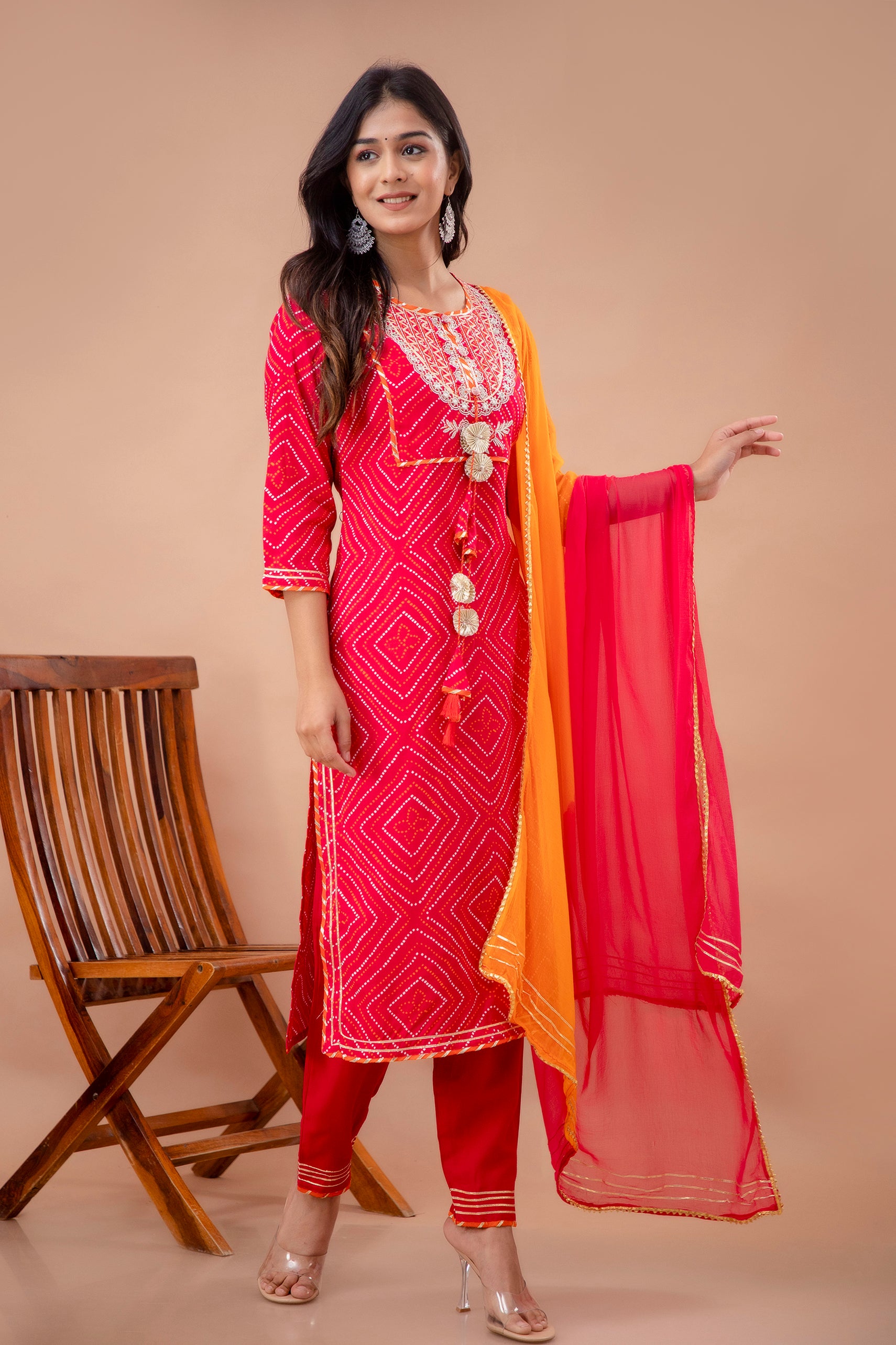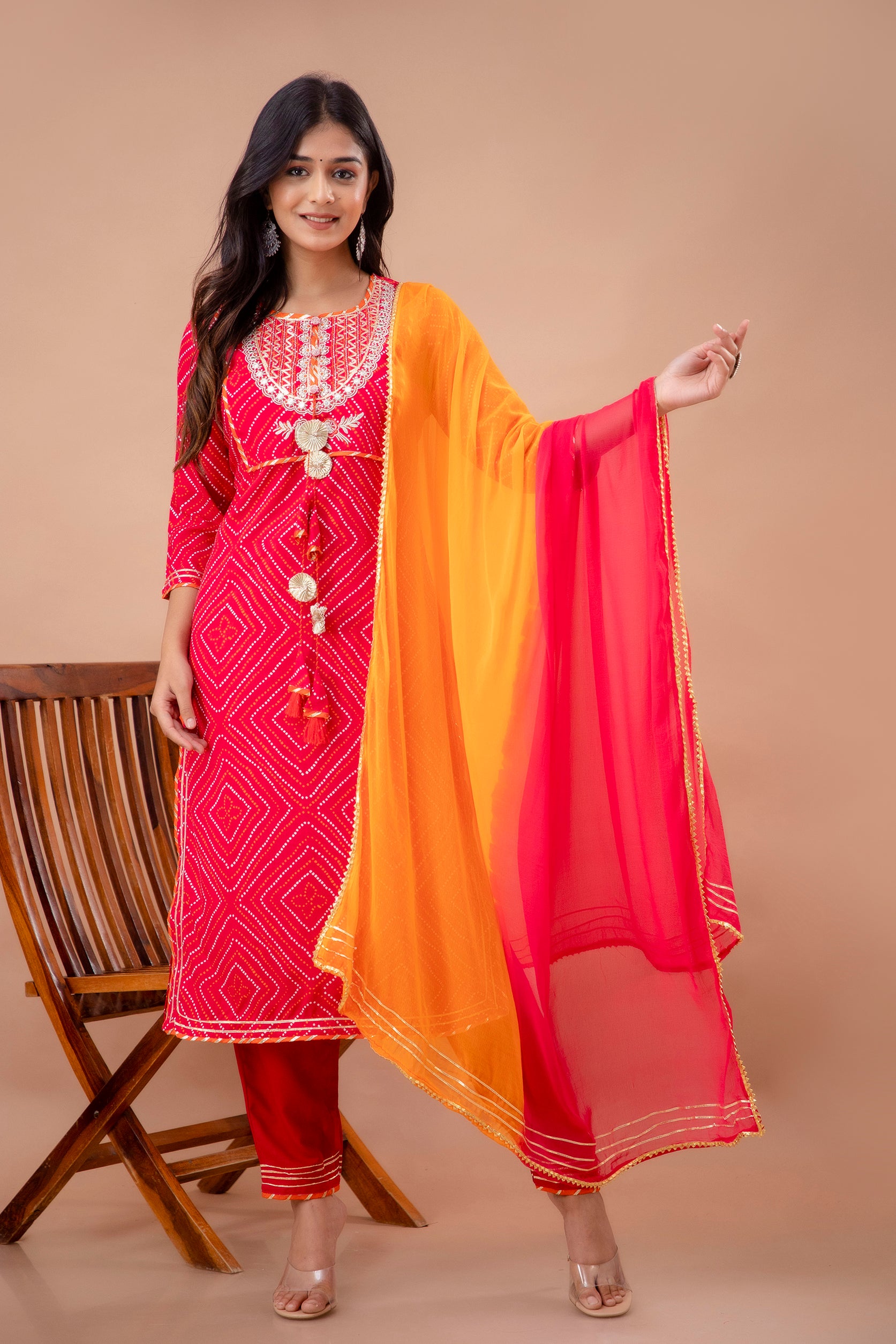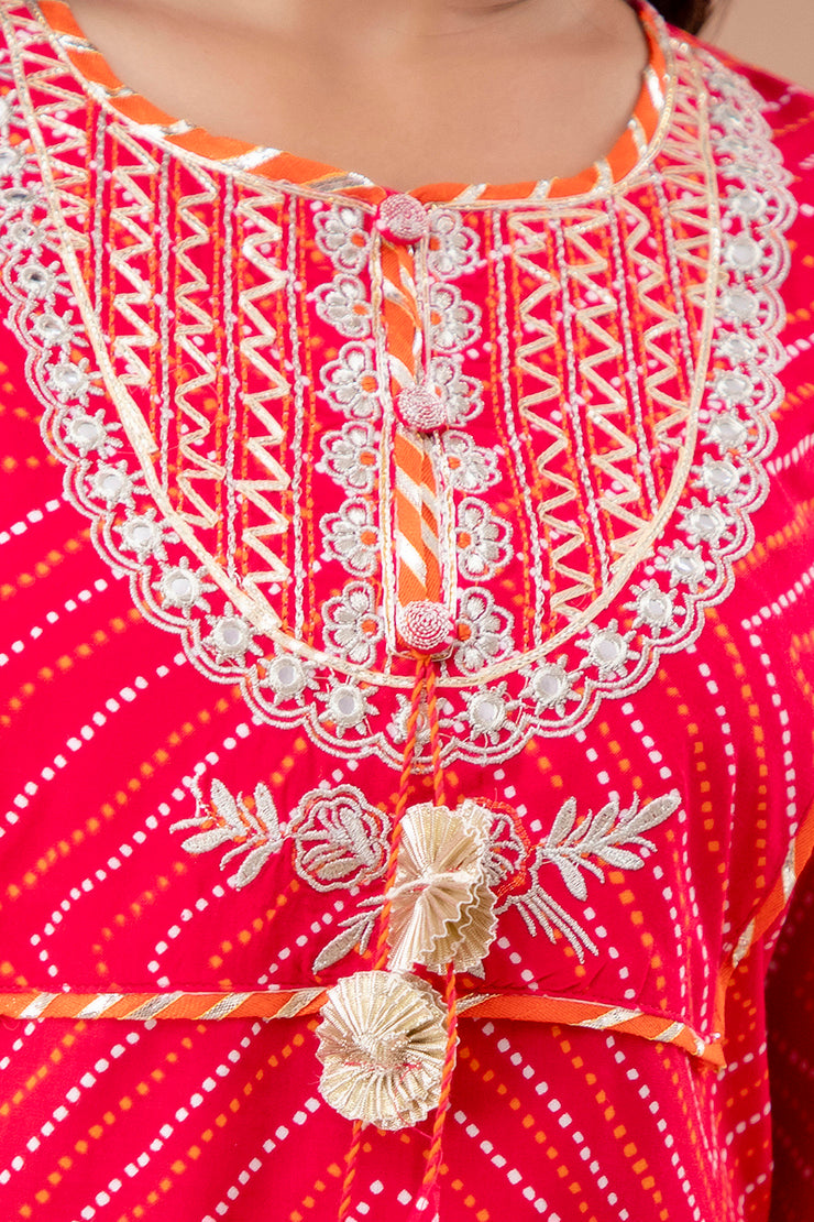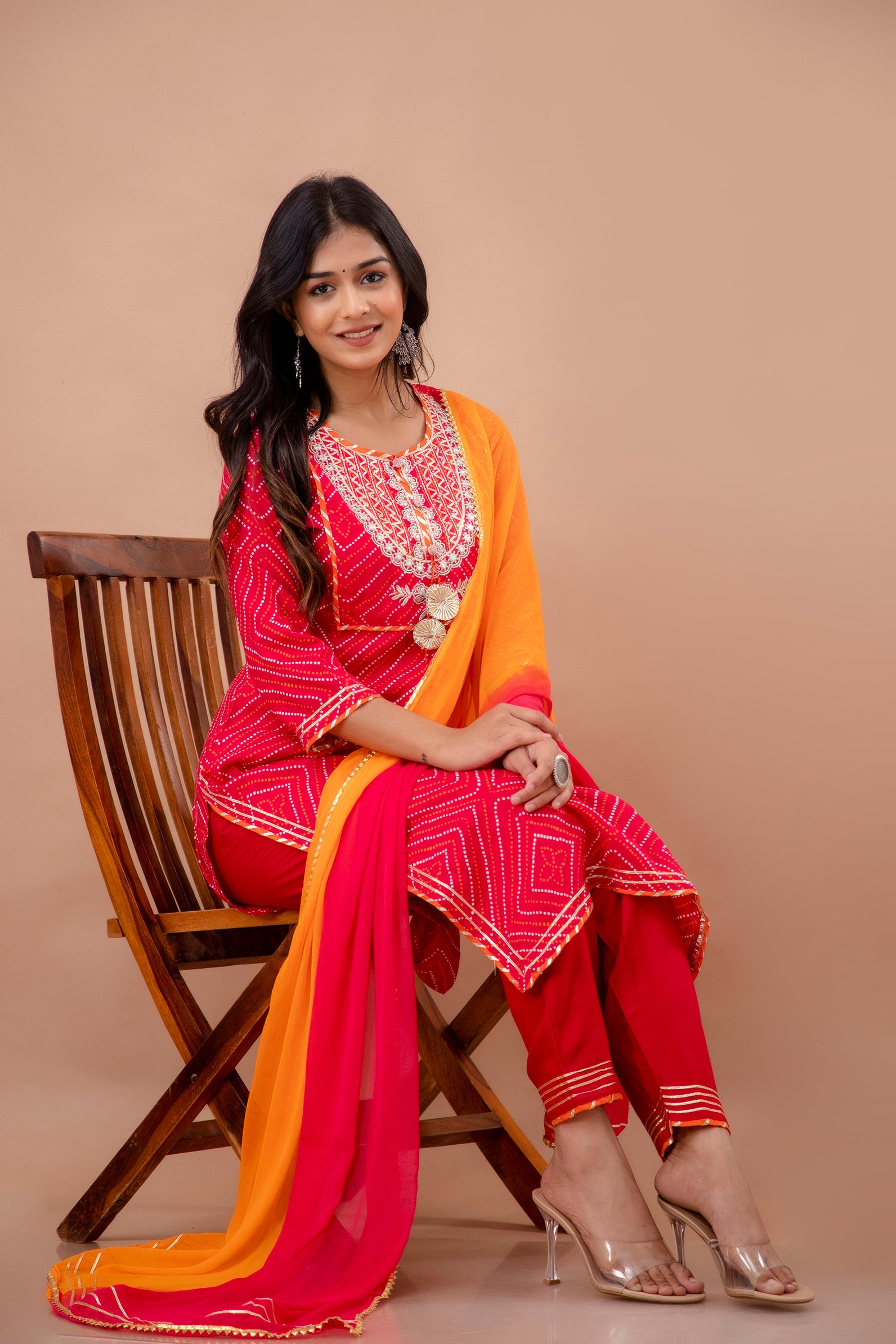 Grace your festive wardrobe with this vibrant three-piece ethnic set, adorned with intricate Gotta Patti embellishments and traditional Bandhani prints. Designed for elegance and ease, it combines ethnic charm with everyday comfort.