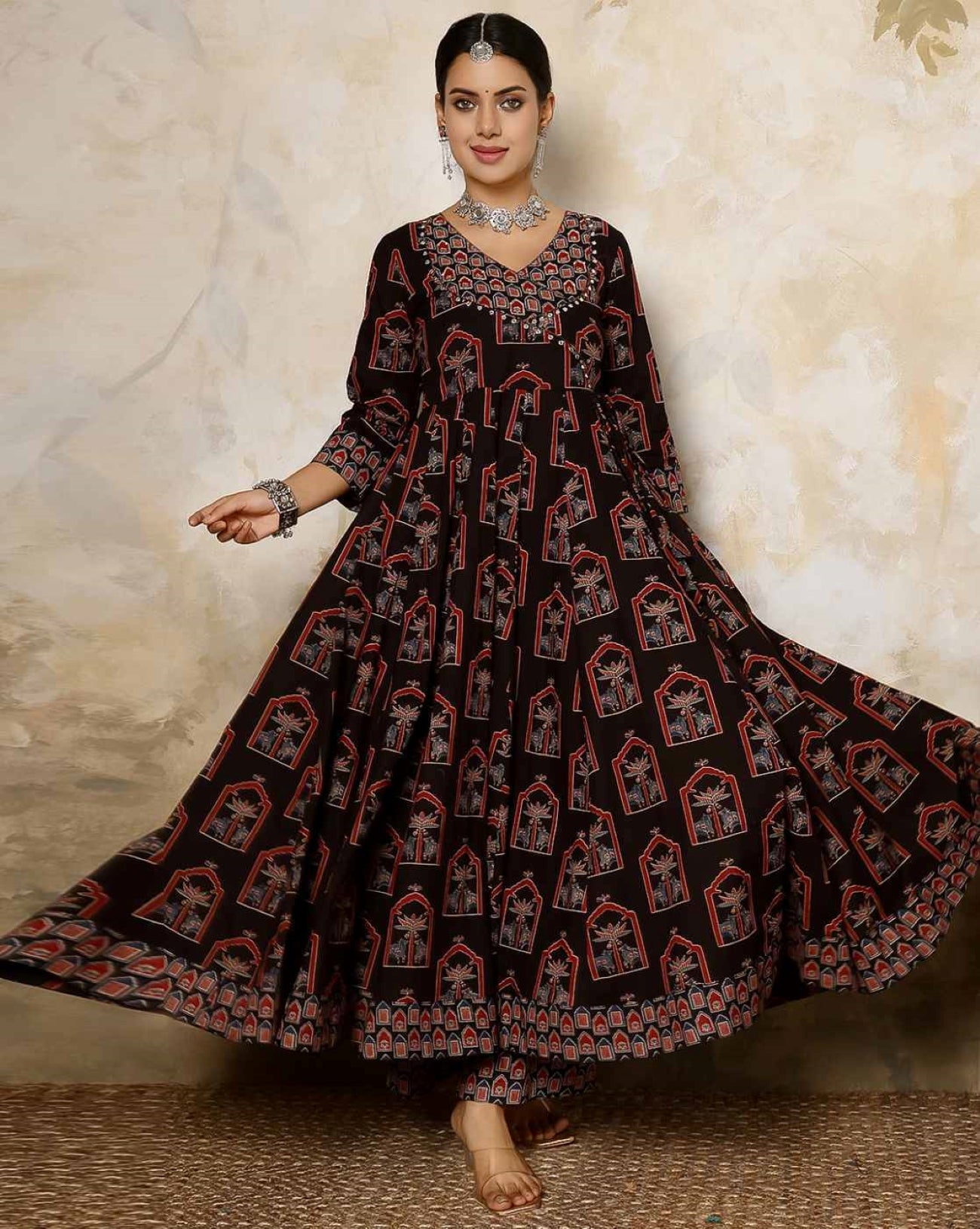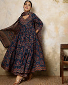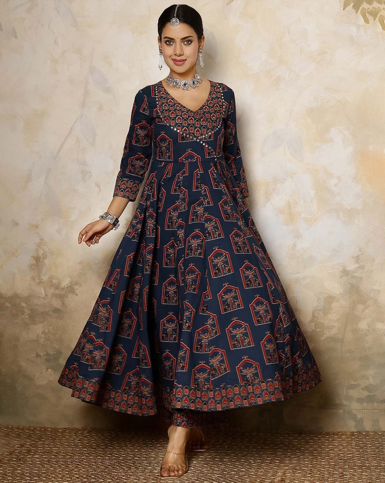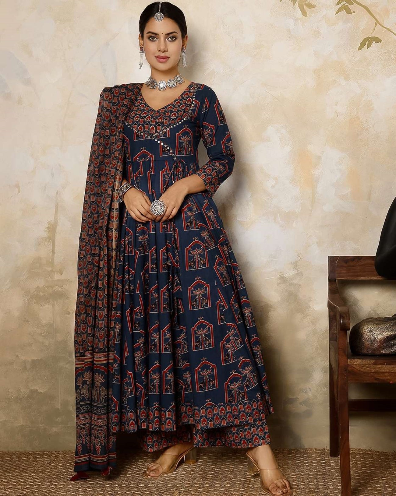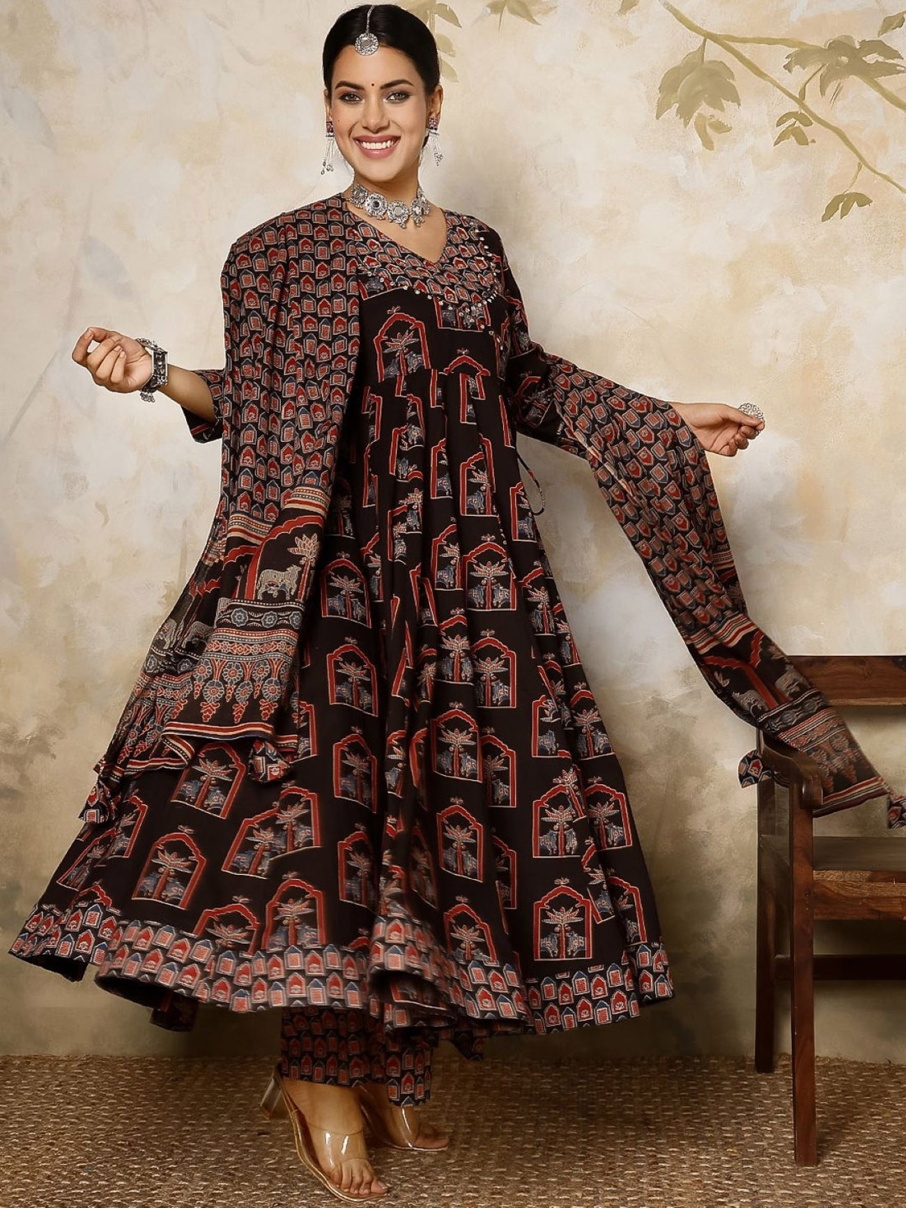 Refresh your ethnic wear collection with this graceful 3-piece Anarkali kurta set, designed for both everyday elegance and festive charm. This set features an ethnic motif printed kurta, matching printed trousers, and a lightweight printed dupatta, making it a stylish and comfortable choice.