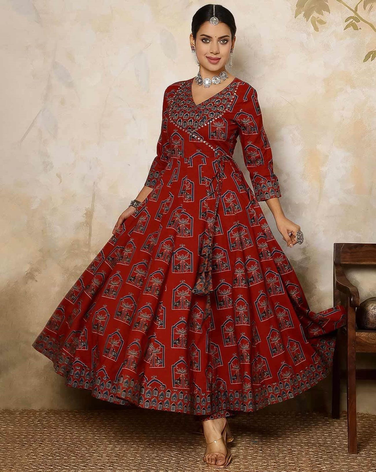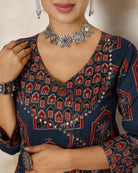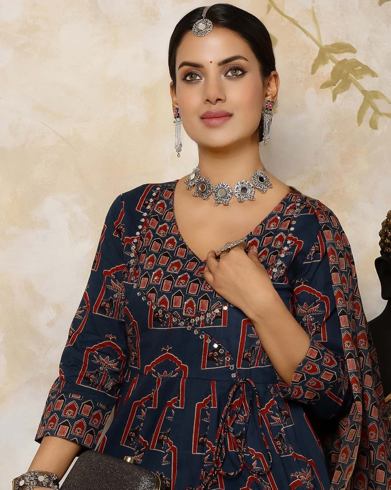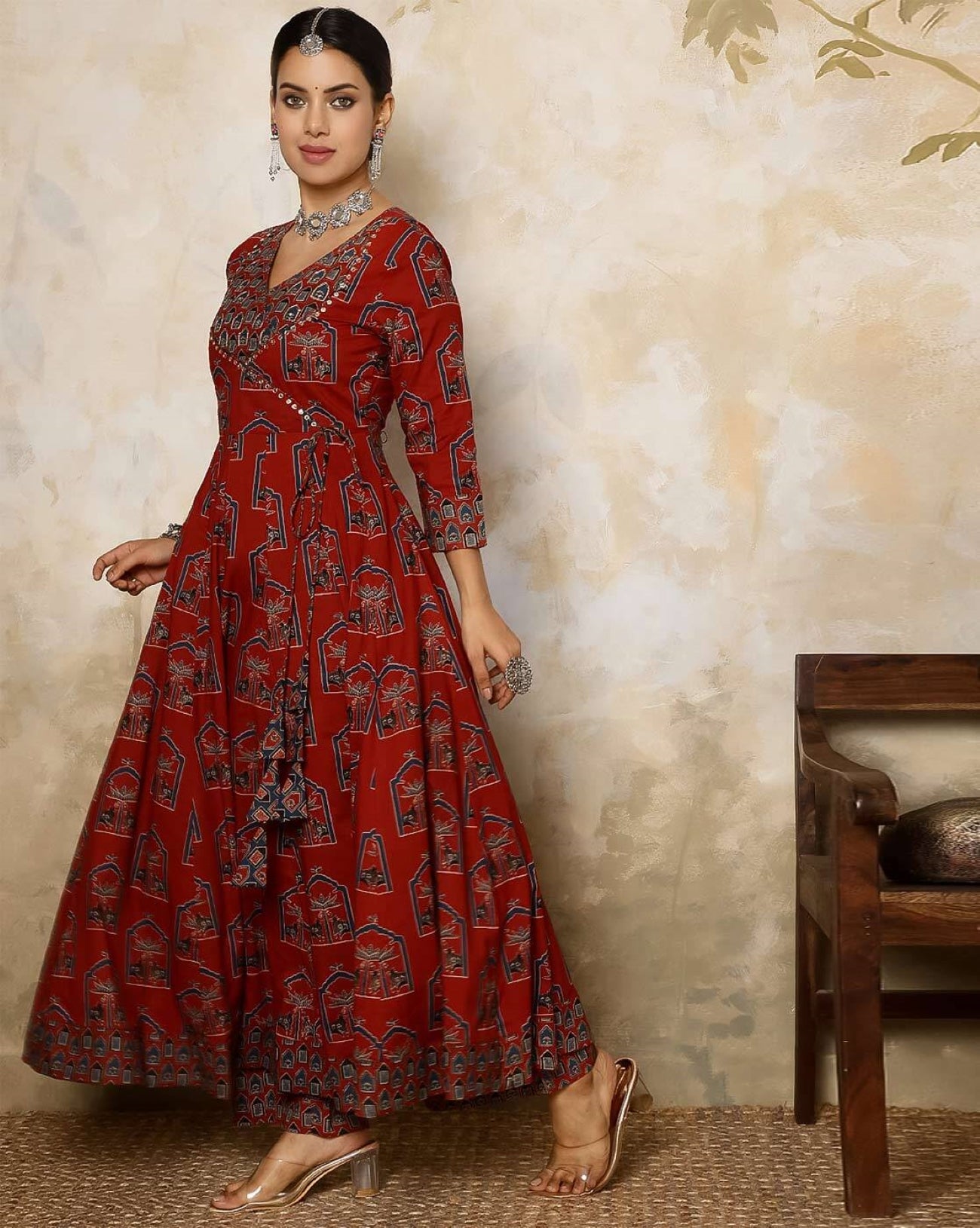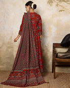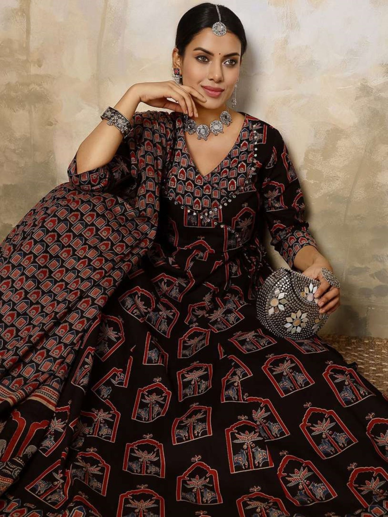 Refresh your ethnic wear collection with this graceful 3-piece Anarkali kurta set, designed for both everyday elegance and festive charm. This set features an ethnic motif printed kurta, matching printed trousers, and a lightweight printed dupatta, making it a stylish and comfortable choice.