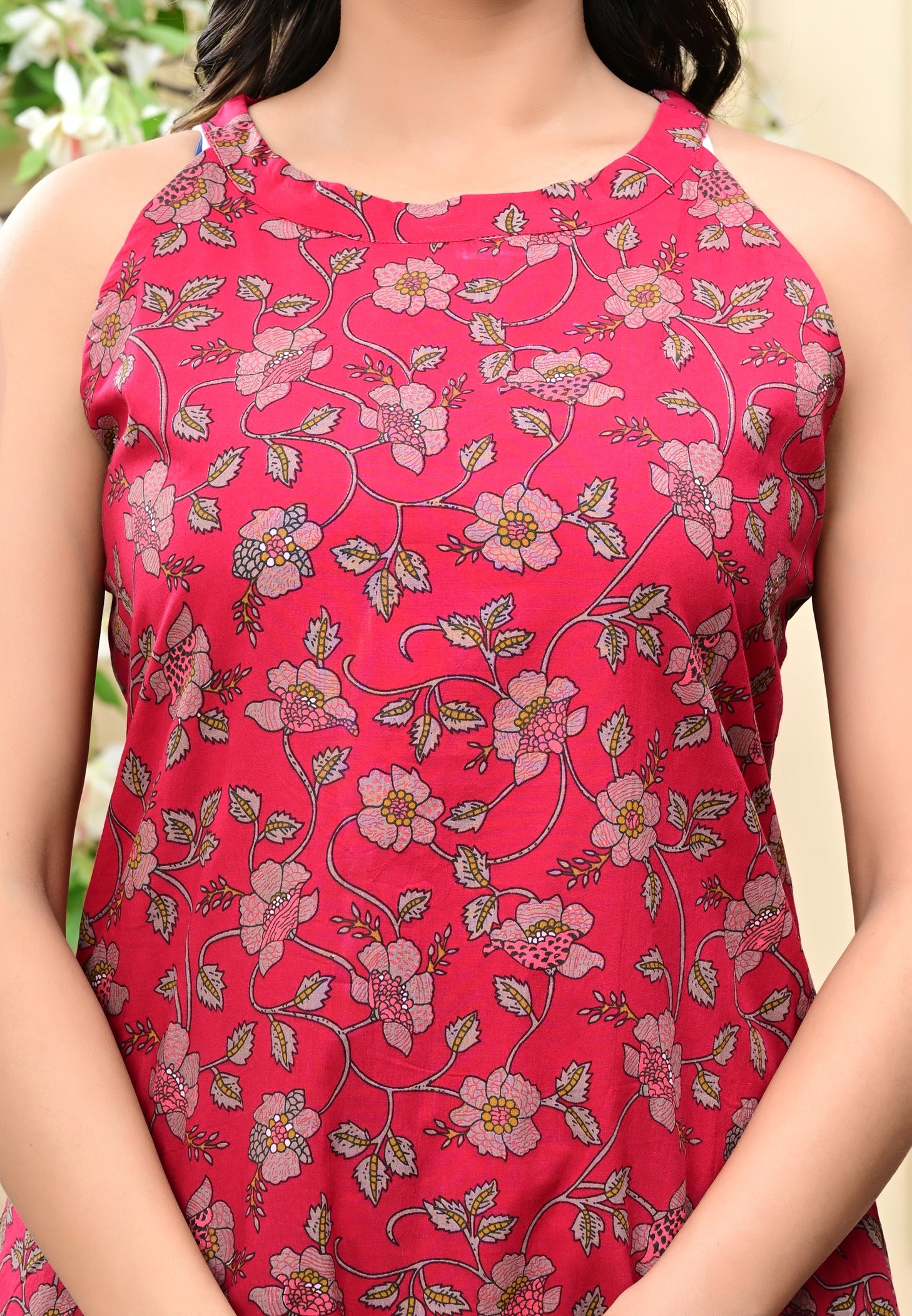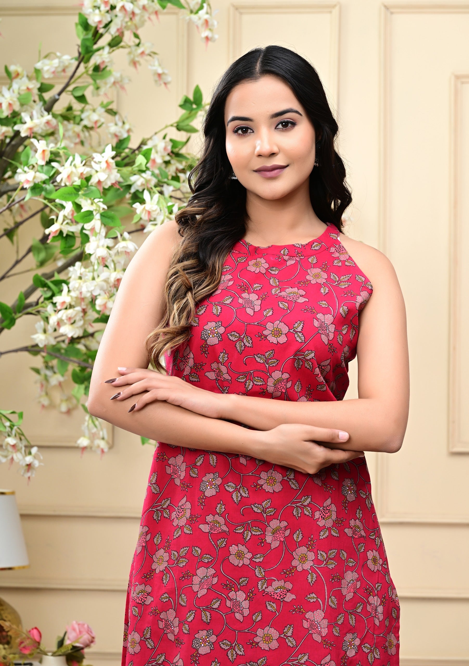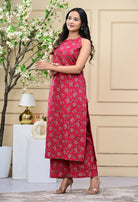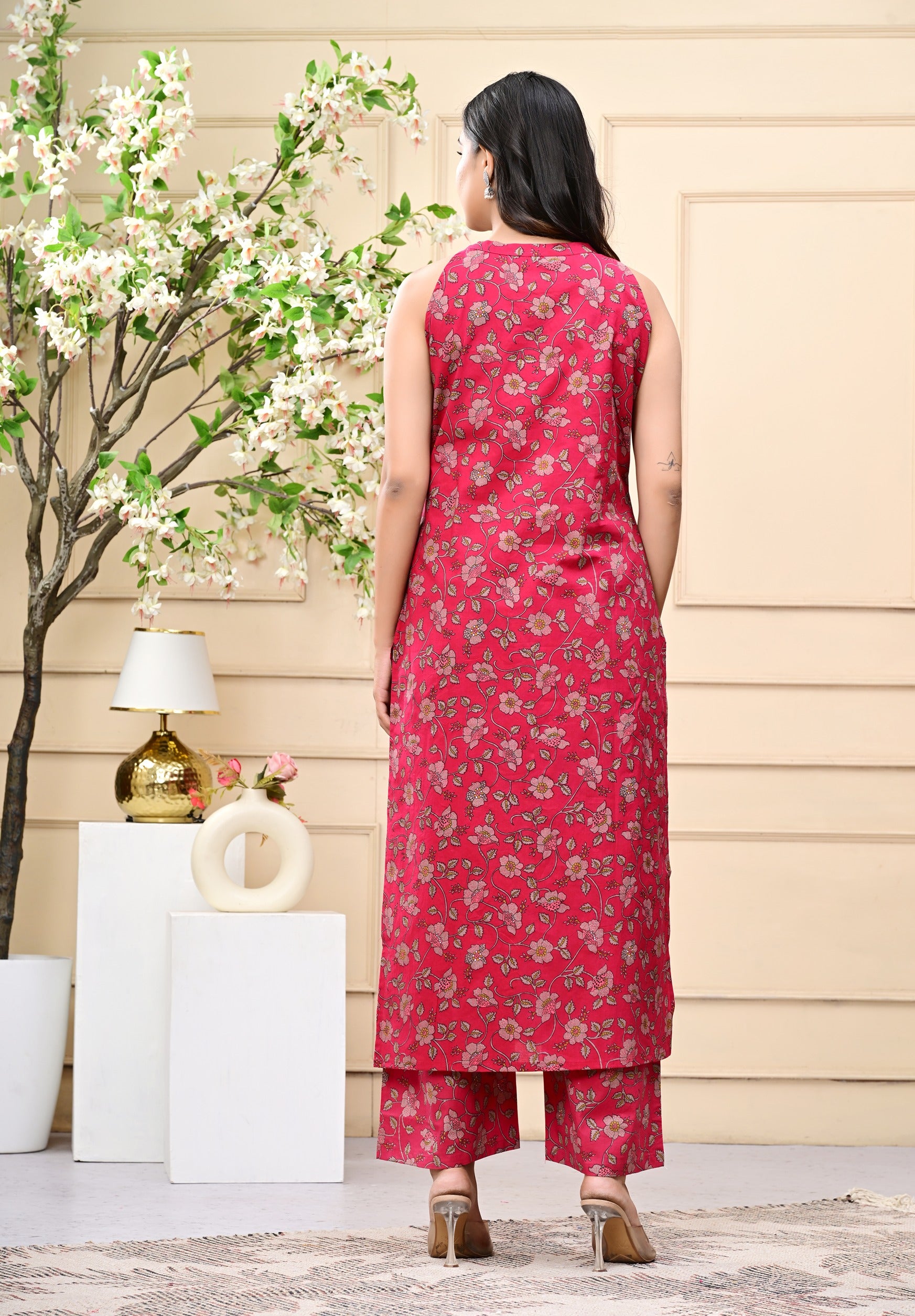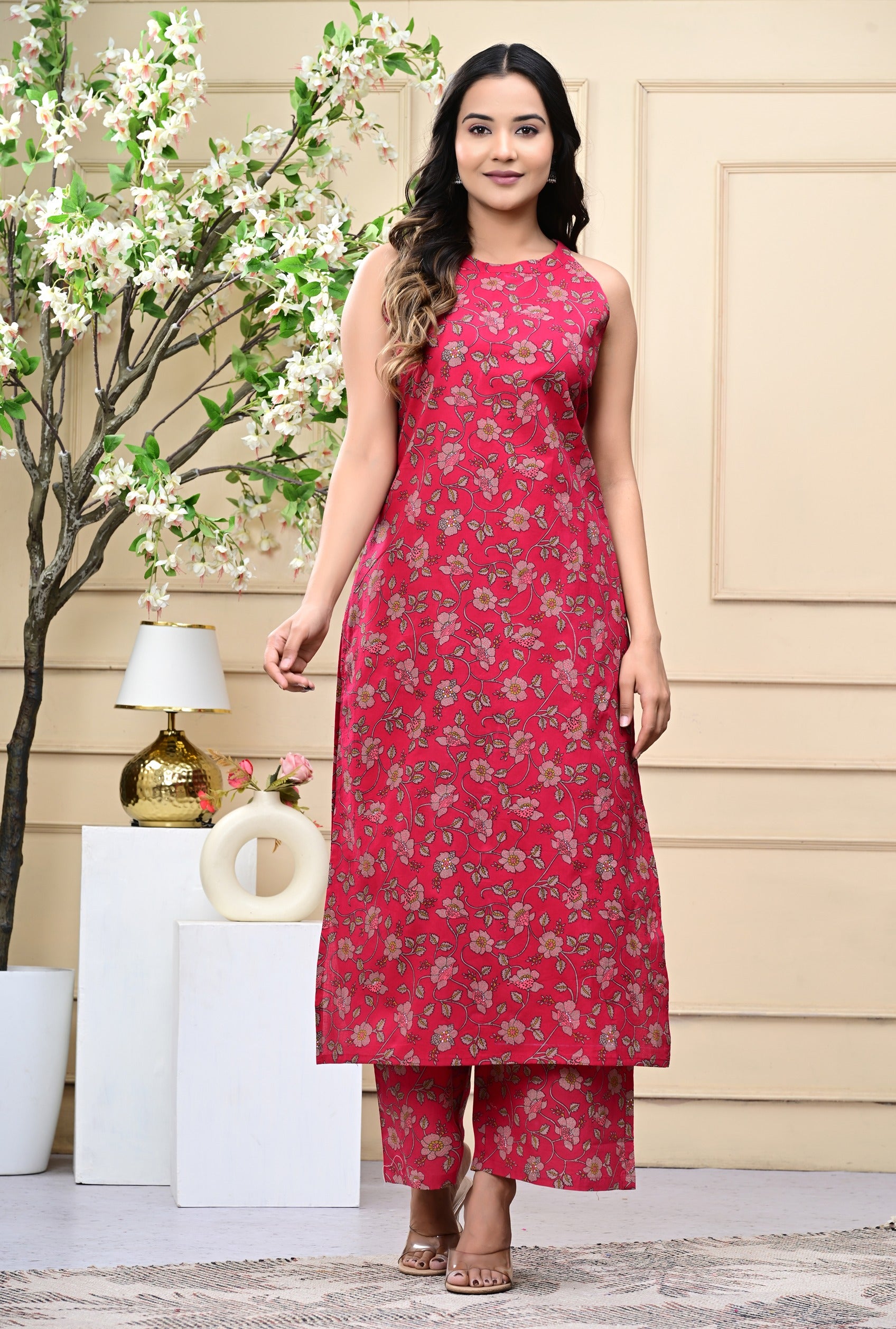 Stay effortlessly stylish and cool in this charming Floral Printed Straight Kurta Plazo Set, featuring refreshing hues of pink, beige, and yellow. Made from 100% pure cotton, this sleeveless kurta with matching palazzos offers breezy comfort and graceful ethnic flair—perfect for warm days, casual outings, or everyday wear.