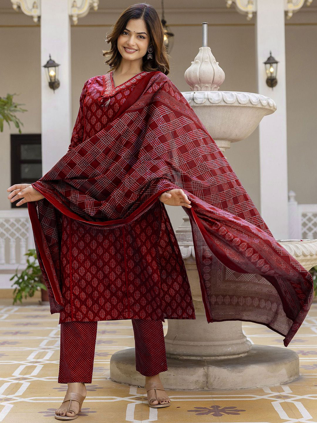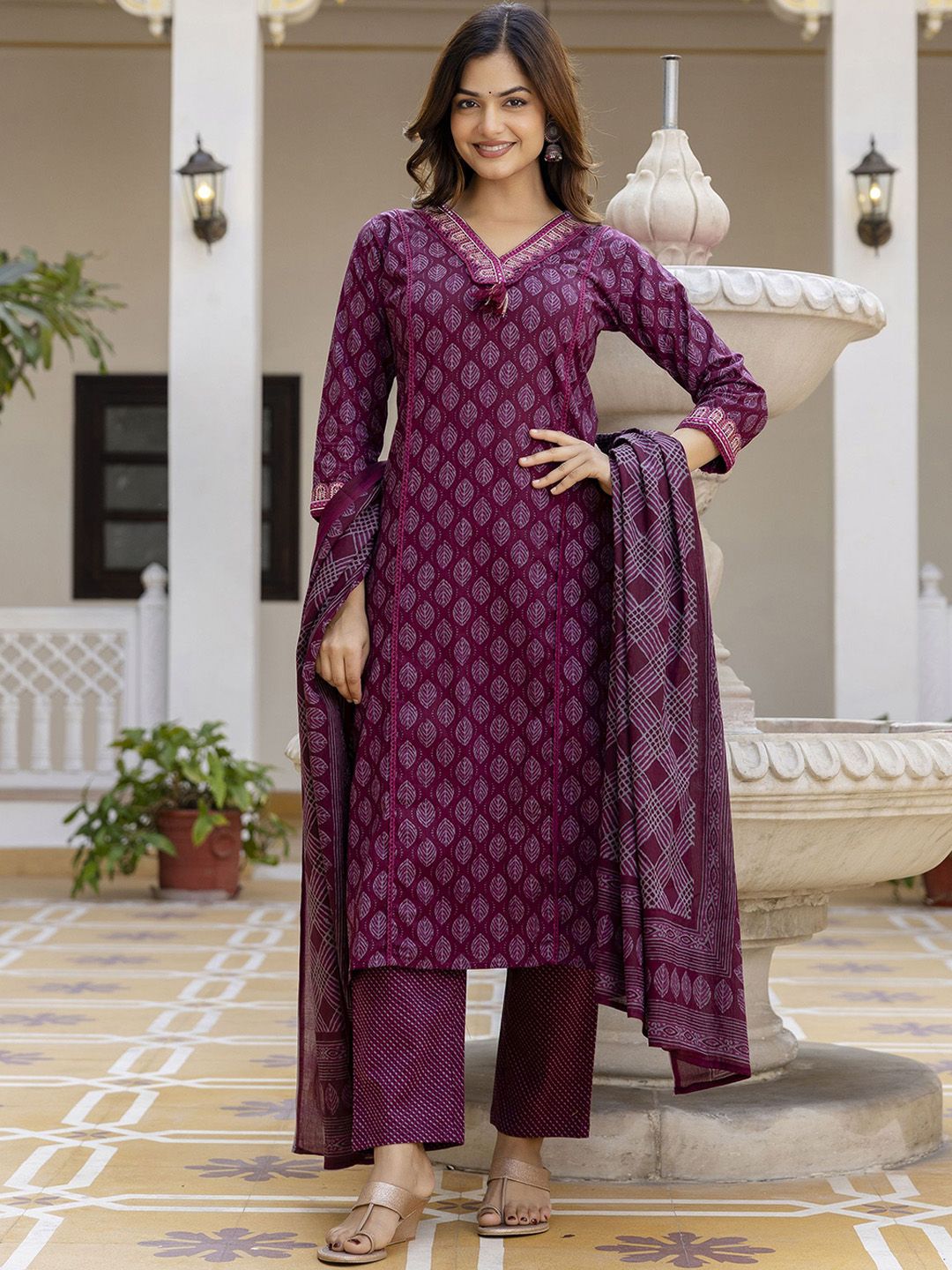 Women's Pure Cotton Printed Handwork Kurta with Pants & Dupatta Set